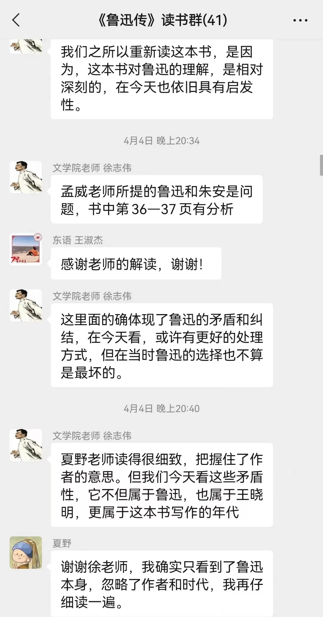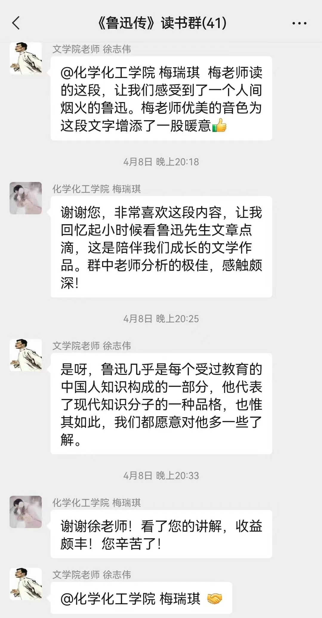 徐志伟老师领读的《无法直面的人生:鲁迅传》带领大家走进了“鲁迅的世界”中,感受着一代文坛宗师鲁迅先生作为“孤勇者”砥砺前行、于历史长河中挣扎的勇气。活动中,教师们通过制作朗读微视频、录制音频等形式分享心得感悟,跨过历史长河在白纸黑字中感触着鲁迅先生人生阶段的起伏。徐志伟老师在读书会总结时提到:“读一本传记,仿佛是陪着别人经历了一生。即使不是这样,至少也感受到了不一样的人生,这有助于我们反观自身的生活,思考人生的意义与方向。”