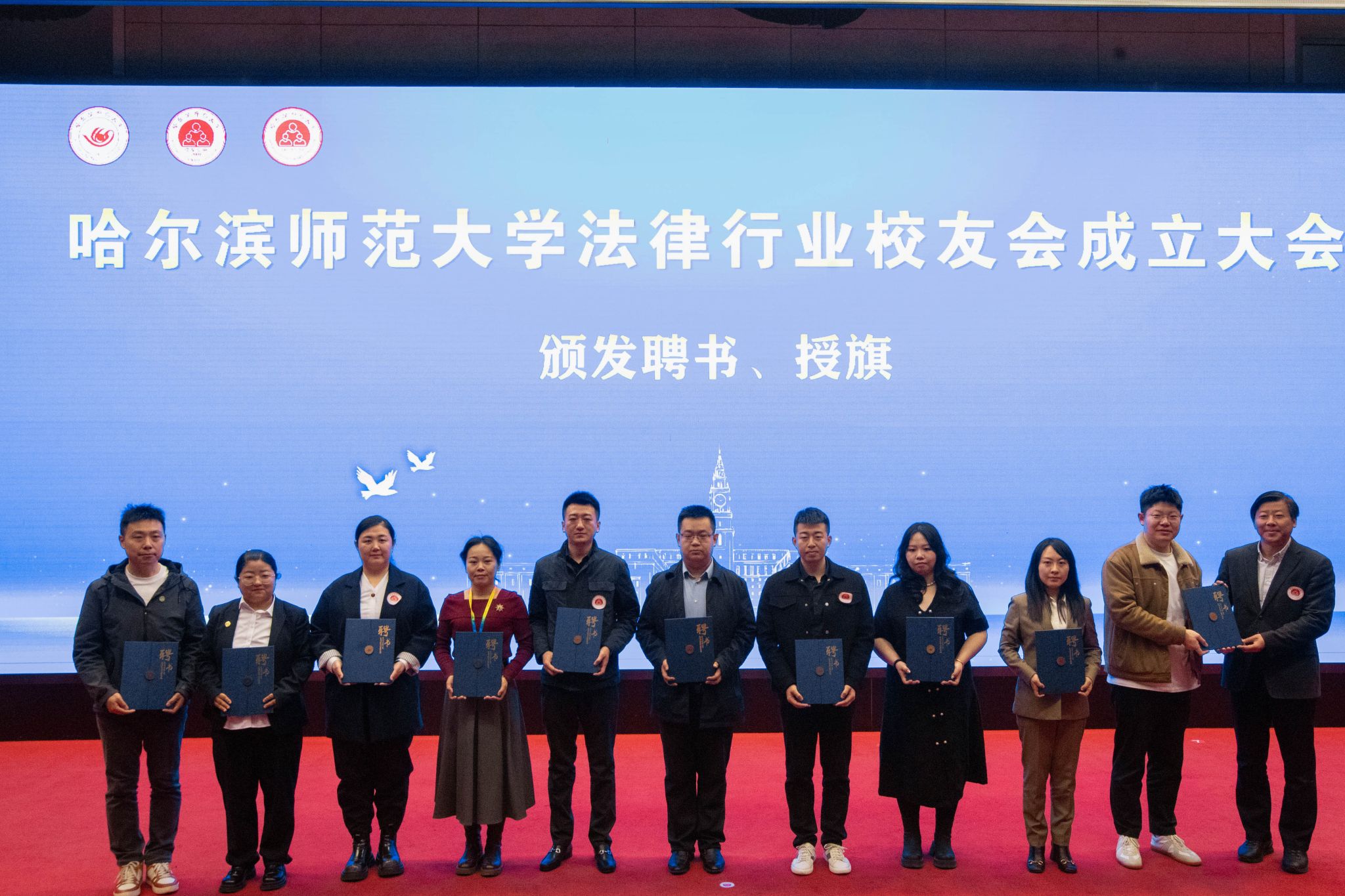宿建宣读了《黑龙江省哈尔滨师范大学校友会关于同意成立法律行业校友会的批复》。法律行业校友会筹建组成员马晶作法律行业校友会筹建工作报告。法学院党委书记李晓航、院长白云先后宣读了《哈尔滨师范大学法律行业校友会章程》和第一届理事会组成人员建议名单、第一届理事会组织机构建议名单,并经会议表决正式通过。与会领导和嘉宾共同为法律行业校友会揭牌。蒋鲲为法律行业校友会授旗,并为当选的名誉会长、会长、副会长、秘书长、理事代表颁发聘书。