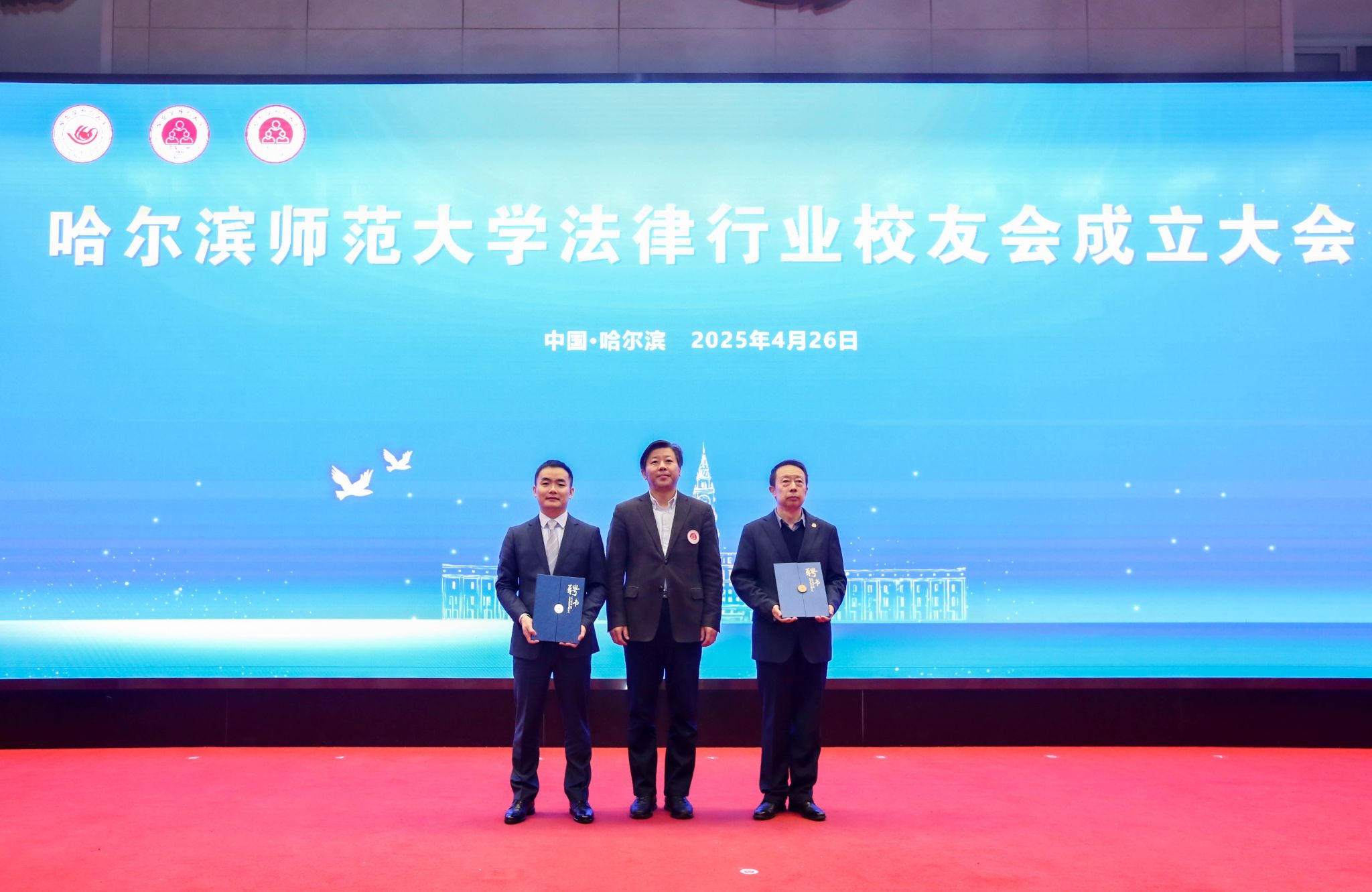 4月26日,哈尔滨师范大学法律行业校友会成立大会暨新时代法治中国建设主题报告会在科学会堂召开。校长蒋鲲,党委副书记王辉,党委常委、统战部部长、校友会秘书长宿建,党委办公室、教务处、学生就业指导处负责人,法学院相关领导、老师及学生代表,从事法律行业相关工作的校友代表共同见证大会盛况。