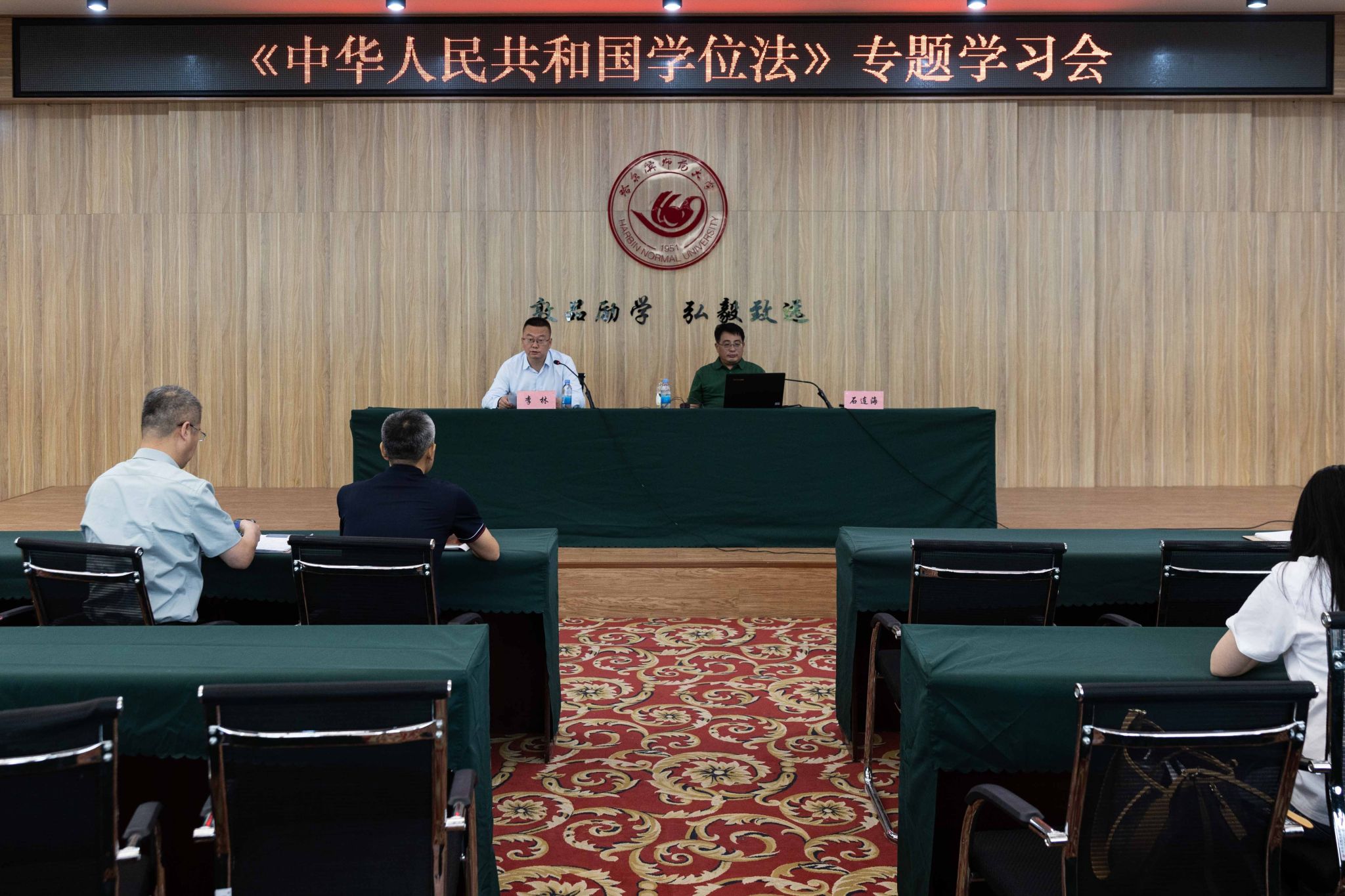 为贯彻落实《中华人民共和国学位法》,全面推进依法治校工作,准确把握《中华人民共和国学位法》内涵和要求,进一步规范学位授予管理,保障学位授予质量,6月13日,我校组织开展哈尔滨师范大学业务大讲堂第25期—《中华人民共和国学位法》专题学习会,党委常委、副校长李林出席并主持会议,研究生学院全体教职工、各培养单位负责研究生工作的主管领导、研究生秘书、研究生辅导员及研究生导师代表参加会议。