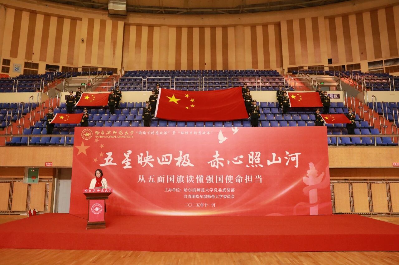 郭砾以《集五方之帜 铸信仰之基——来自祖国“四极一心”的力量》为题,讲授了一堂深刻生动的“国旗下的思政课·场馆里的思政课”。她表示,五面国旗串联祖国四极与心脏,凝聚着边疆卫士的赤诚与全国人民的同心伟力,每一面都镌刻着忠诚与坚守,也承载着哈师大学子扎根边疆、报效祖国的赤诚担当。从北极寒疆的坚毅守望,到东极哨所的青春蜕变;从南海礁盘的寸土不让,到西陲大地的深深扎根,再到天安门广场国旗承载的国家嘱托,每一段故事都回答着“强国建设,青年何为?”的时代命题。更加坚定了哈师大学子“身在最北方,心向党中央”的政治忠诚。全体师生备受鼓舞、热血沸腾,掌声经久不息。