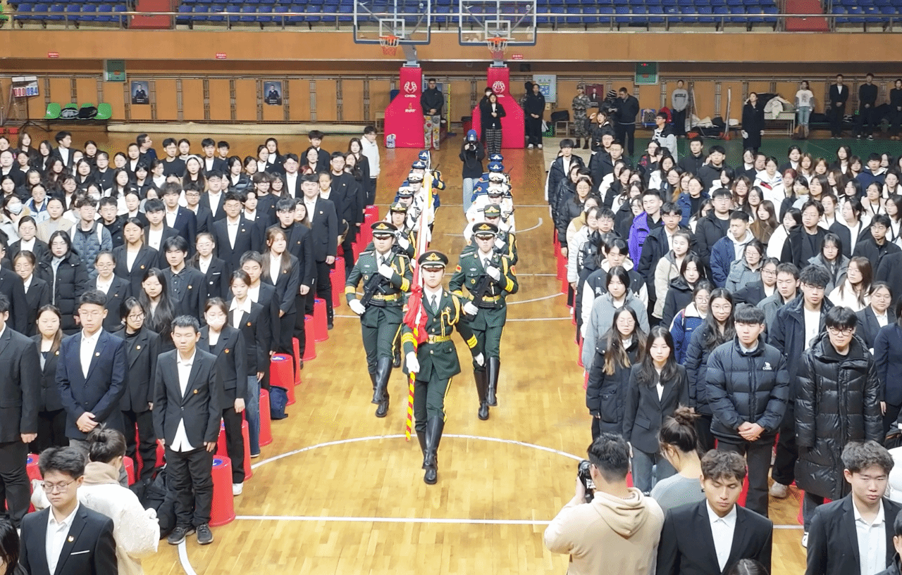 2025年11月12日,学校在体育馆内举行“五星映四极,赤心照山河——从五面国旗读懂强国使命担当”主题升旗仪式暨“国旗下的思政课·场馆里的思政课”。校党委副书记、工会主席郭砾,党委常委、宣传部(党委教师工作部)部长张艳君,党委常委、组织部部长王羽,学生工作部(学生处、武装部)、校团委、学生就业指导处等相关职能部门负责人,各学院党委副书记、辅导员及千余名学生共同参与,沉浸式聆听这场铸魂润心、励志笃行的思政大课。仪式由校团委书记刘春玲主持。