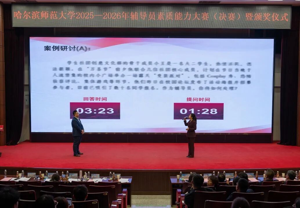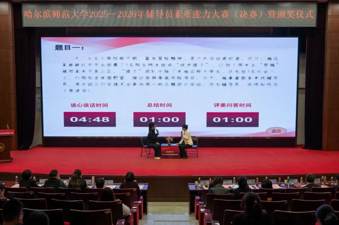 为深入贯彻落实全国、全省教育大会精神,全面落实新时代立德树人工程,聚焦“第四支队伍”建设,不断提升我校辅导员队伍的理论水平、职业能力和专业素养,着力构建全员全过程全方位全领域育人新格局。3月25日,哈尔滨师范大学辅导员素质能力大赛(决赛)暨颁奖仪式在科学会堂成功举办。校党委副书记、工会主席郭砾出席活动。学校相关职能部门负责人、各学院党委副书记,全体辅导员,本硕博学生代表及兄弟院校近百名辅导员同仁到场观摩。决赛特邀东北林业大学、哈尔滨理工大学、黑龙江中医药大学、哈尔滨学院、黑龙江职业学院学工领域专家领导共同担任评委。