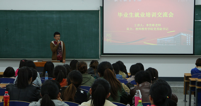 交流会分为交流分享和求职培训两个部分。交流分享中学院邀请了2011级中签约伊春一中刘岩、天津北辰区教育局王茂臻、广西柳州铁一中顾聪涵和考上湖南省洪江市国税局曾纯等四名同学从省内重点中学面试招聘、省外教育局面试招聘、公务员国考和省外重点中学招聘等角度,以自身的实际经历出发,讲述了他们在求职过程中的宝贵经验和心路历程,从公务员招考到面试教师等多个方面展示了师范生就业岗位应聘的基本技能。求职培训部分由学院副书记李贵彬主讲,他从2015届学生就业情况介绍、就业信息的搜集方法、个人应聘材料的准备、面试和招考的准备、择业注意事项等五个方面给学生做了全面、细致的讲解,提出了心态平和、定位准确、积极寻找和坚守诚信等要求。