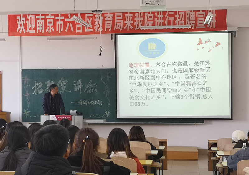 (魏娜/文)教育科学学院于3月27日在社科楼213室举办了南京六合区教育局学前教育招聘洽谈会。学校就业指导处副处长韩方立、教育科学学院党委书记辛显文、党委副书记王清艳出席此次招聘会,教育科学学院2015级学前教育学生近百人参加了此次招聘宣讲会。