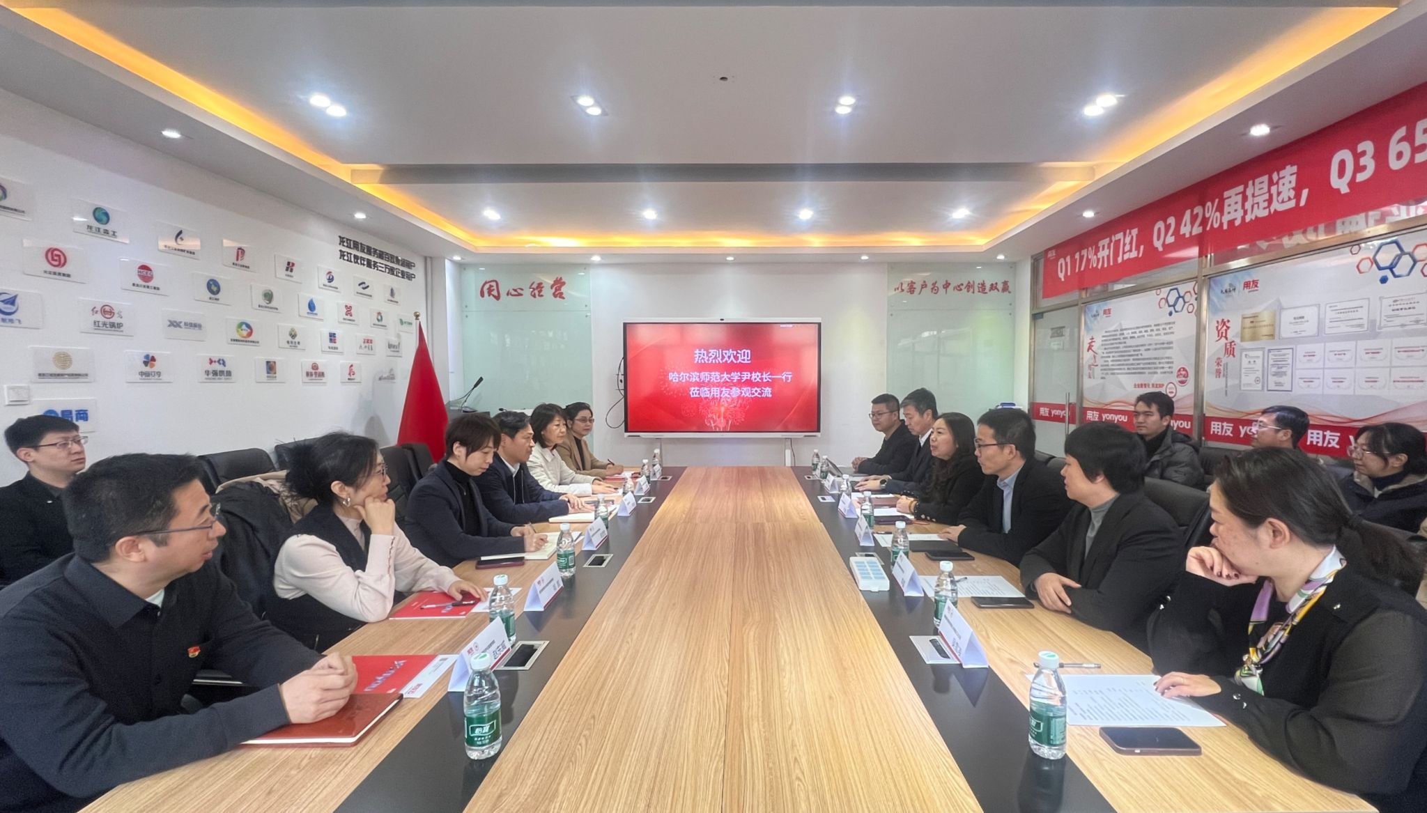 尹剑锋代表哈尔滨师范大学感谢黑龙江用友网络科技有限公司的热情接待。他指出,学校与用友网络科技有限公司长期以来保持着良好的合作关系,合作基础深厚。本次走访交流是进一步推动校企共建、促进资源共享的关键契机,也将成为双方在人才培养、实习就业、党建共建、产教融合等多个领域深化合作的重要桥梁。未来,学校将进一步构建“党建共建+实习基地+行业导师+项目共研”四位一体的常态化合作机制,在设立专门联络群组、签署战略合作协议、聘请企业导师等方面进行深度探索,推动校企共建走深走实。