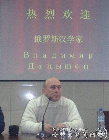 俄罗斯克拉斯诺亚尔斯克国立师范大学历史系知名教授、著名汉学家弗拉基米尔•大气生(Дацышен•Владимир•Григорьевич)及夫人来哈尔滨师范大学斯拉夫语学院做了精彩的学术报告。报告从中俄关系的发展历史、早年汉学在俄国的研究情况以及他本人对我国东北历史、文化等方面的见解进行了卓有成效的探讨,并对当前俄罗斯人掀起的汉语热等方面作了详细的介绍。他的报告对中俄两国文化、教育等方面的交流,特别是对我国了解俄罗斯汉学研究动态具有现实意义。报告后学院师生与专家及其家人还进行了热烈的讨论和交流,师生反响热烈,收获颇丰。