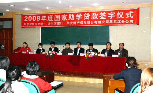 4月20日上午,我校与哈尔滨银行、华安财产保险股份有限公司黑龙江分公司2009年国家助学贷款签字仪式在江南校区图书馆三楼报告厅隆重举行。哈尔滨银行学府支行行长于德军、副行长周彦辉、华安财产保险股份有限公司黑龙江分公司学贷险部经理苑彬,我校党委副书记王为正出席会议,财务处、学生工作处主管领导,哈尔滨银行和保险公司工作人员,各学院相关的辅导员及部分获得国家助学贷款学生参加了签字仪式。