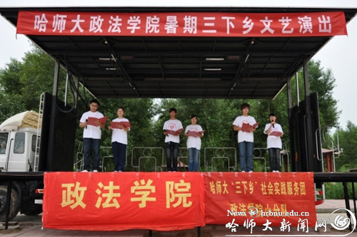 暑假期间,政法学院 “三下乡”社会实践活动在安达市青肯泡乡农义村进行。7月20日下午,“三下乡”文艺汇演在村休闲广场拉开帷幕。学校党委副书记、校长王选章,党委副书记王为正同绥化市人大以及安达市政府领导等一同观看了演出。演出节目形式多样,异彩纷呈,博得了领导和老乡们的阵阵掌声,在村民中引起了强烈反响。