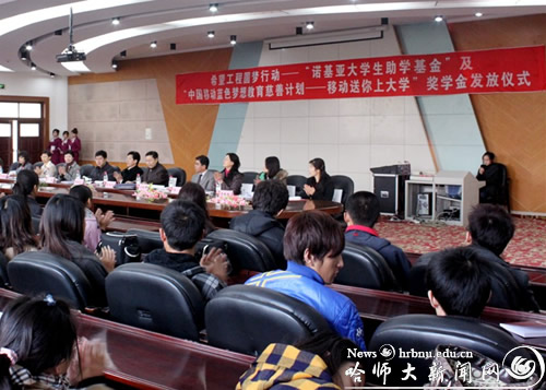 10月18日下午,在松北校区图书馆一楼报告厅,我校各学院200名师生代表参加了希望工程圆梦行动——“诺基亚大学生助学基金”及“中国移动蓝色梦想教育慈善计划——移动送你上大学”奖学金发放仪式。中国青少年发展基金会常务副秘书长杨晓禹、诺基亚(中国)投资有限公司企业社会责任总监傅蕾、团省委副书记关威和黑龙江省青少年发展基金会、中国移动黑龙江公司有关领导同我校党委副书记王为正等领导出席了活动。