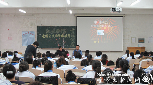 王彦庆重点从“为什么中国模式备受关注”、“中国模式的内涵特征”和“中国模式所面临的挑战”三个部分讲述了中国模式。他用1952至2009年以来的我国人均GDP收入、恩格尔系数和贫困人口数的变化来展示中国经济发展所取得的伟大成就,并且对“华盛顿共识”、“北京共识”做了深刻对比,使得在场所有同学深刻地认识到我国基本国情,并在了解经济发展状况下,产生了强烈的爱国热情。他还告诫同学们即使我国现在在整体经济上取得了巨大成就,也不能忽视中国模式仍然面临着严峻的挑战,当代大学生应该丰富知识,努力提高自身能力,为社会主义建设做出贡献。
