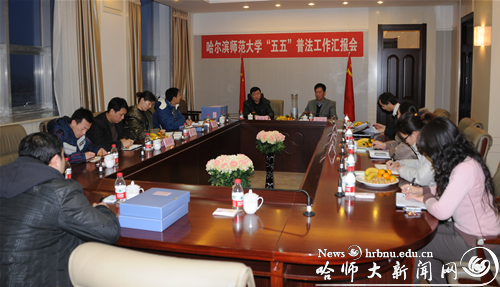王广明在汇报中说,根据《中共中央国务院转发<中央宣传部、司法部关于在公民中开展法制宣传教育的第五个五年计划>的通知》等文件精神,2006年以来,哈师大认真贯彻落实全国、全省普法办的总体要求和部署,结合实际,以宪法宣传教育为核心,以教育法律法规宣传教育为重点,广泛深入地开展“五五”普法宣传教育工作。一是加强领导,周密部署,确保“五五”普法工作顺利开展;二是区分层次,彰显特色,确保“五五”普法工作全面推进;三是联系实际,学用结合,确保“五五”普法工作取得实效。目前,学校各级领导干部依法治校、民主管理的能力水平进一步提高;广大师生员工严格遵守法律法规,法律意识进一步增强,履行法律规定义务的自觉性和依法维护自身合法权益的能力明显提高,学校已形成了依法管理、依法治校、依法执教的良好局面。