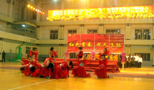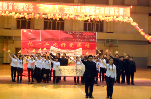 为纪念“一二•九”爱国运动75周年,基础教育学院举办了大型“红歌晚会”、“演讲比赛”、“配乐诗朗诵”以及“书画、摄影、征文”比赛等系列活动。全体师生积极参与,在全院范围内掀起了一次爱国主义教育新高潮。