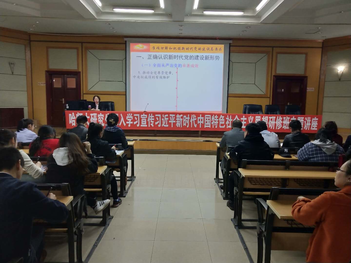 (王岩/文)为深入学习宣传贯彻党的十九大精神,领会习近平新时代中国特色社会主义思想,增强研究生思想政治理论素养,4月3日下午,研究生深入学习宣传习近平新时代中国特色社会主义思想专题研修班专题讲座,在江北校区图书馆三楼报告厅如期举办。讲座由省委十九大宣讲团成员、中共黑龙江省委党校、省行政学院党史党建教研部主任、校重点学科带头人、硕士研究生导师孙艳春教授主讲。研究生学院和研工部党支部全体教师党员、研修班全体学员、各学院研究生党支部书记和经济学院2015级学生党员代表参加本次讲座。讲座由党委研工部常务副部长张艳君主持。