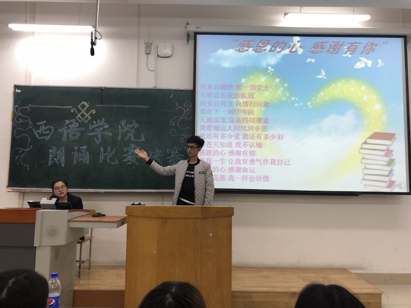 (李慧娴/文)为提高英语口语表达能力,促进英语思维能力和诵读能力的发展,丰富词汇量及短语,激发学生学习兴趣,帮助学生们养成朗读英语的习惯,西语学院于5月9日在西语楼551室举办英语朗读比赛。选u按2016级和2017级部分学生参加了此次比赛。