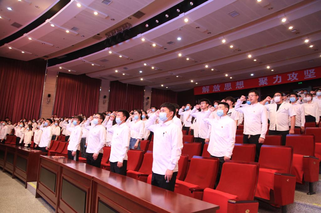 在新党员入党宣誓和老党员重温誓词仪式上,2020级研究生党员张希淼领誓,全体新老党员面向党旗,举起右手,向党作出庄严承诺,表达对党的忠诚和为共产主义事业奋斗终身的决心。