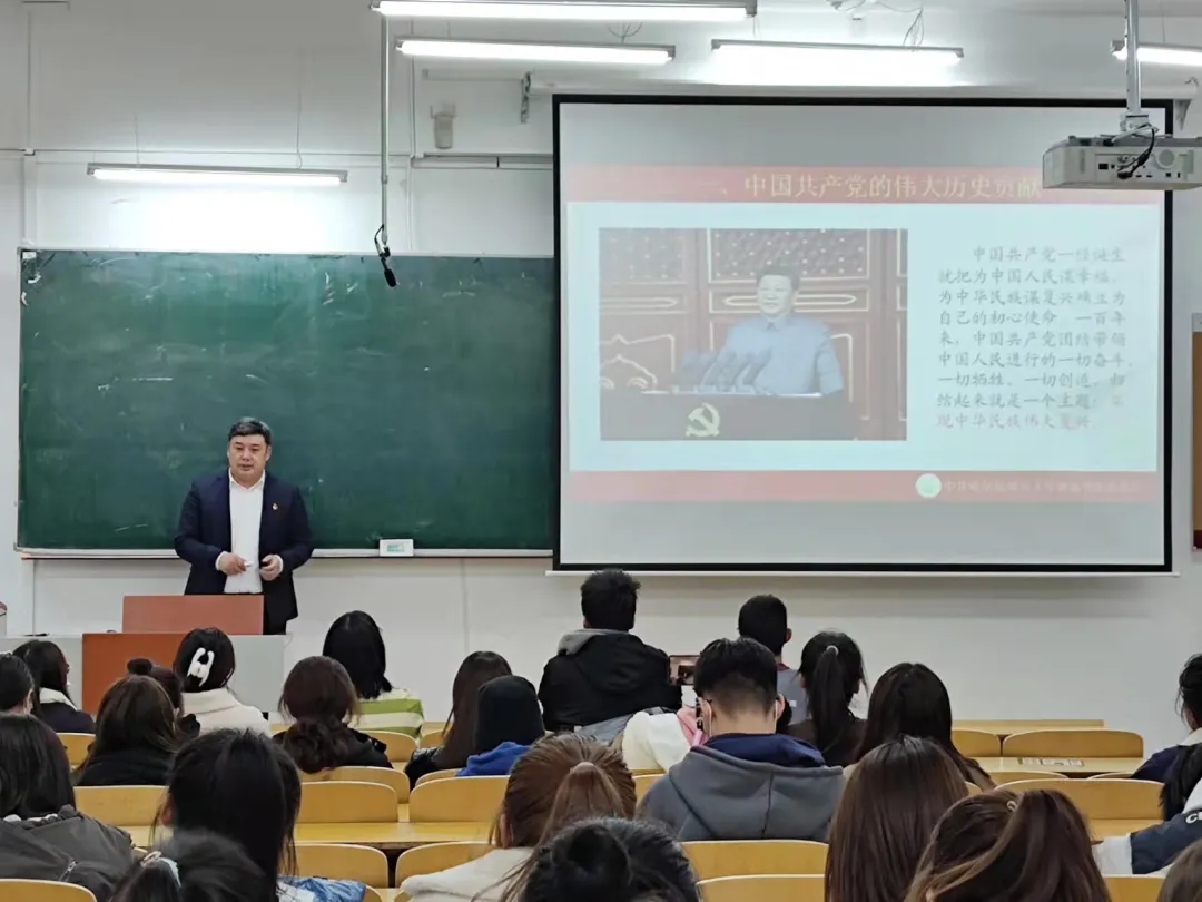 报告分为中国共产党百年历史成就、百年党史重要事件回顾和“不忘初心、牢记使命”永跟党走三个部分。李贵彬用习近平总书记“七一”重要讲话的“一个庄严宣告”“三个深刻改变”“四个伟大成就”向学生们介绍了中国共产党百年历史成就,号召学生们继承“坚持真理、坚守理想,践行初心、担当使命,不怕牺牲、英勇斗争,对党忠诚、不负人民”的伟大建党精神,弘扬党的光荣传统,赓续红色血脉,永远把伟大建党精神继承下去、发扬光大,激扬起继往开来、不懈奋斗的精神力量。李贵彬从新民主主义革命、社会主义革命和建设、改革开放和社会主义现代化建设、新时代中国特色社会主义等四个时期,用经典鲜活的案例和生动朴实的语言,介绍了长征、抗日战争、开国大典、社会主义改造、抗美援朝战争、改革开放、脱贫攻坚、抗击疫情等重大党史事件,让学生们感受到党百年发展的伟大及辉煌历程。要求全体同学坚定信仰跟党走,以史为鉴,开创未来,响应党的号召:“以实现中华民族伟大复兴为己任,增强做中国人的志气、骨气、底气,不负时代,不负韶华,不负党和人民的殷切期望!”