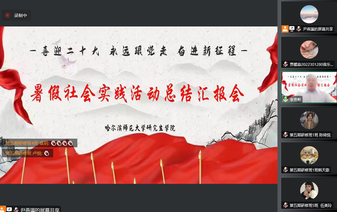 为深入学习宣传习近平新时代中国特色社会主义思想,引领广大研究生在社会课堂中受教育、长才干、做贡献,研究生学院暑假期间组织开展了“喜迎二十大永远跟党走 奋进新征程”为主题的社会实践活动,并于11月2日召开了暑假社会实践活动总结汇报会。研究学院党委书记李贵彬、教育管理办公室主任刘勇、第五期深入学习宣传习近平新时代中国特色社会主义思想专题研修班全体成员及各学院研究生代表出席本次汇报会。