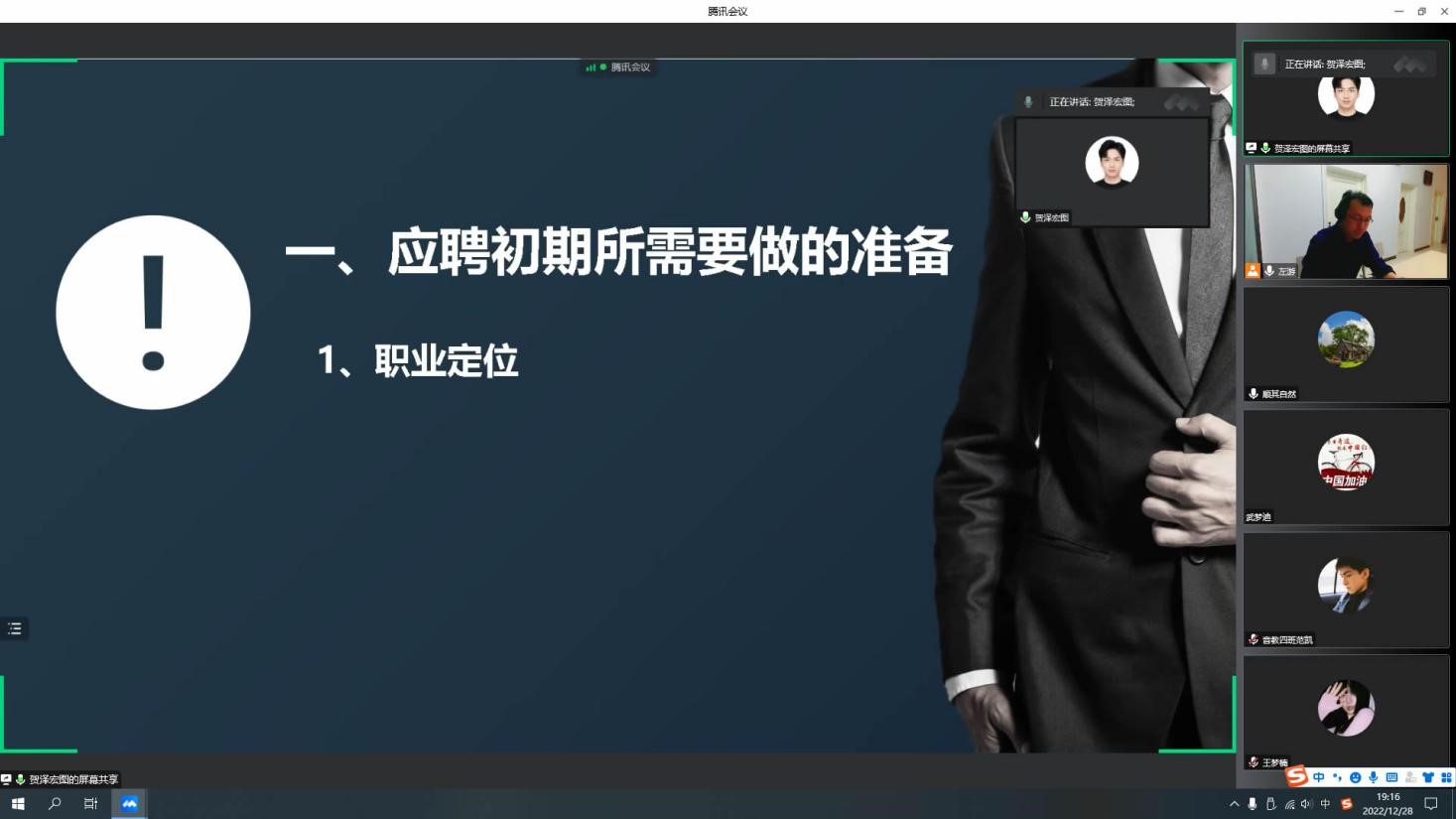 会上,2023届毕业生代表贺泽宏图、盖海超、范凯三名同学先后作了就业实习经验分享。他们从自身找工作和参加实习的经历谈起,重点和同学们分享了筛选招聘信息、制作投递简历、录课、参加面试、签约技巧、在用人单位实习等经验。这三名同学目前已经凭借自身的努力通过了考核,初步和用人单位达成签约意向;他们的经历对其他准备和正在就业的同学有非常积极的借鉴意义。