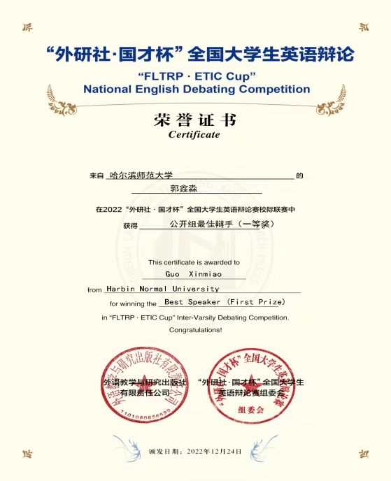 2022年12月24日,由外研社全国大学生英语辩论赛组委会主办的“FLTRP.ETIC Cup”“外研社·国才杯”全国大学生英语辩论赛2022社团招新高校联赛落下帷幕。来自地理科学学院2021级地理科学专业一班的郭鑫淼同学代表哈尔滨师范大学参赛,并荣获公开组一等奖、“个人最佳辩手”荣誉称号。