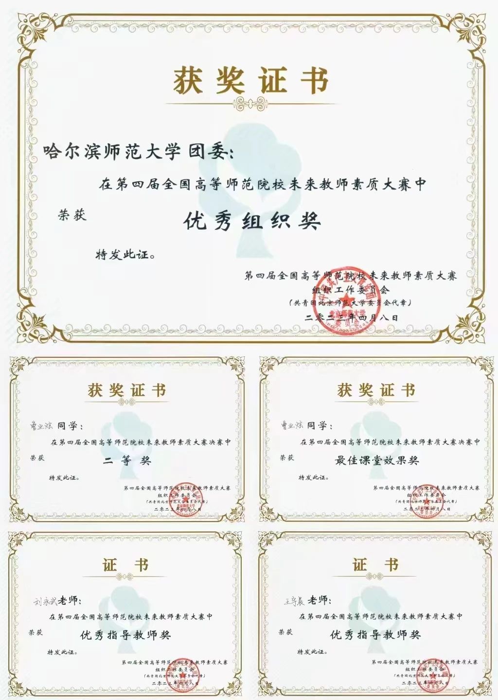 本次大赛共分为模拟课堂和个人风采展示两大环节,采用情景模拟的方式全方位考察选手的教学实践能力、课堂设计能力、气氛调节能力等综合素质及有理想信念、有道德情操、有扎实学识、有仁爱之心的“四有”好老师品质。我校选手曹业炫秉承着“敦品励学,弘毅致远”的校训精神,沉着冷静、不惧压力、稳定发挥,一路披荆斩棘、过关斩将,最终凭借大方得体的教态、富有激情的授课语言和生动有趣的课堂互动获得了仅设5席的个人专项奖“最佳课堂效果奖”和第四届全国高等师范院校未来教师素质大赛决赛二等奖。我校音乐学院研究生导师刘永武副教授、音乐学院团委副书记王宇晨荣获“优秀指导教师”。同时,我校团委作为第四届全国高等师范院校未来教师素质大赛八大赛区主办方之一,荣获“优秀组织奖”;我校文学院邢起辉和物理与电子工程学院何沐阳获得东北赛区优秀奖。据悉,我校已连续两届在全国高等师范院校未来教师素质大赛中取得优异成绩。这充分展示了师大学子扎实的教学技能和专业的教师素质及我校教师精湛的专业指导水平,体现了学校师范生教育教学的培养质量和第二课堂在师范生培养中的助力作用。