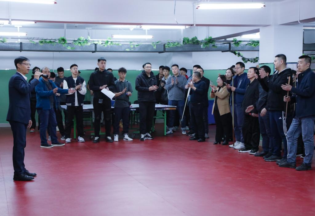 杨世君在讲话中首先向后勤管理处和体育科学学院给予本次比赛的大力支持表示感谢。他指出,这是三年新冠疫情以来的第一次大规模的教职工体育赛事,也是充分展现我校广大台球爱好者精湛球技和良好精神风貌的一次盛会。台球运动在我校有着广泛的群众基础,近年来,越来越多的教职工参与到这项运动中,并常年坚持练习,难能可贵。为进一步推广台球运动,校工会已经举办过九届台球比赛,并通过各种方式支持教职工台球协会开展活动,提升我校教职工台球竞技水平。