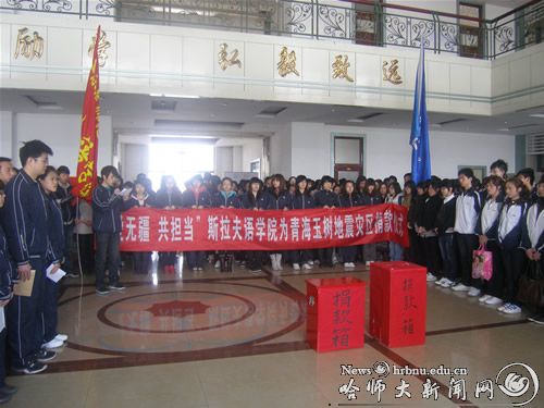4月20日中午,斯拉夫语学院举行“爱无疆,共担当”为青海玉树地震灾区捐款仪式。全院学生为地震灾区死难同胞默哀一分钟后,学生代表向全体学生发出捐赠倡议。学生们积极踊跃地献出自己的爱心,并表示一个人的力量可能非常渺小、微不足道,但只要万众一心,伸出援助之手,灾区人民必将战胜震魔,重建家园,重拾美好生活!当晚黑龙江电视台《新闻联播》对这次捐款活动进行了报道。4月21日下午,政法学院在松北及呼兰两个校区同时举行了主题为“情系玉树,大爱无疆”向青海玉树地震遇难同胞默哀及捐款仪式。广大学生希望这些饱含着爱心的捐款,能够给灾难中的同胞带去废墟中重建家园的勇气和力量。当天,物理与电子工程学院也在学院大厅设立了捐款箱,有80余名教职工为灾区积极踊跃慷慨解囊,奉献爱心。与此同时,学院广大学生也积极参与到这次向灾区捐款的活动中来,共同帮助灾区人民渡过难关。