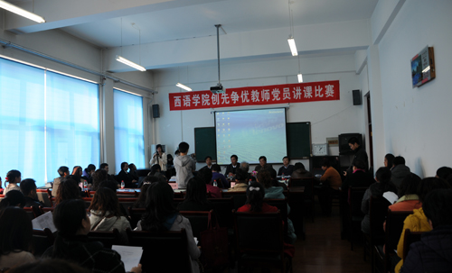 西语学院围绕“强校建设”开展创先争优活动设计了系列活动,包括教师党员优质课评选活动; 教师党员科研贡献奖评比活动; 学生党员志愿者活动; 学生党员专业水平测试活动; “三办”党员工作满意度情况调查活动; 优秀党员教师、优秀学生党员、模范党务工作者、优秀党支部评比活动等。此次“教师党员讲课比赛”是系列活动之一,进入“教师党员讲课比赛”决赛的八名教师由学院各系根据本系45岁以下全体党员教师历时一个半月的讲课比赛预赛成绩推选出来。经过三个多小时的角逐,评出一等奖2名、二等奖2名、三等奖2名、特别展示奖(小语种)2名。学校外语督导高枝青、隋慧丽两位教授进行了赛后点评。西语学院院长姜涛对活动进行了总结。学校党委组织部部长尹占军及西语学院的部分领导老师也参加了此次活动。