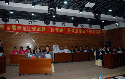 11月17日,由黑龙江省高等学校后勤管理指导中心、黑龙江省教育后勤管理协会和黑龙江省高校伙食专业委员会主办,我校饮食服务中心承办的全省首届高校餐饮服务卫生安全知识竞赛在我校松北校区梦溪宾馆隆重举行。省教育厅发展规划处副处长杨臣,省高等学校后勤管理指导中心主任许庆禄,省教育后勤管理协会常务副理事长兼秘书长李志强,省高校第十四届伙专会主任、副主任、秘书长和副秘书长等领导及来自全省15所高校的45名选手和200余名观众参加了此次活动。