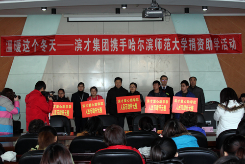 12月24日中午,黑龙江省滨才房地产开发集团有限公司“温暖这个冬天——滨才集团携手哈尔滨师范大学捐资助学仪式”在我校江北校区图书馆一楼报告厅举行。我校党委副书记王为正、滨才集团人力资源总监郭月杰、营销部项目经理李波和我校学生工作处负责人及受资助所在学院的师生代表参加了捐助仪式。