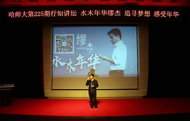 讲座开始前,同学们积极通过在微信留言墙上留言的形式表达对缪杰的喜爱之情,现场气氛热烈。讲座开始,缪杰在同学们热烈的掌声中走上舞台。虽说他是首次来到哈尔滨师范大学,却也被同学们的热情打动,并为同学们演唱了《在他乡》。