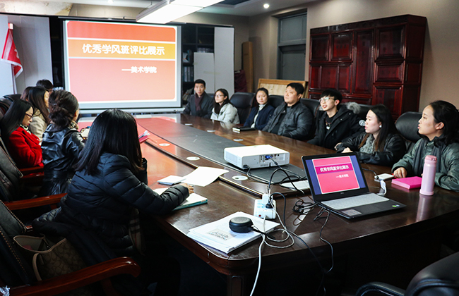 (王慧/文)11月8日下午,美术学院开展了第三届“优秀班集体”评选活动。学院党委副书记顾德光、全体辅导员参与活动并担任评委。活动旨在更好地推动学院班集体创建,展示班风班貌,增强班级凝聚力。