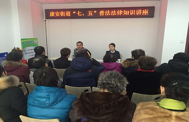 (孙振轩/文)为贯彻依法治国理念,落实普法宣传教育,营造学法知法,守法用法的氛围,法学院开展了“进校园入社区”普法宣传活动。2017年12月14日,法学院携手康安街道办事处举办法律知识讲座。本次普法知识讲座,由隋晶秋老师和梅奕敏老师指导,2014级胡若雪同学、朱丹同学以及2015级韩冬洋同学参与。