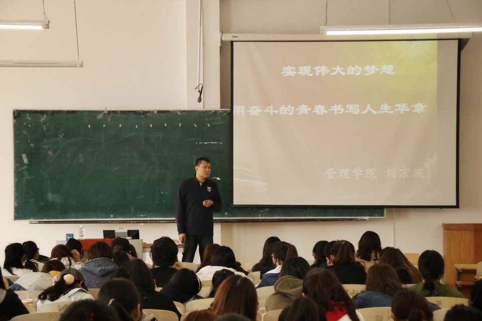 会议伊始,刘宗波首先强调了大学生学习理论的重要性,并指出十九大报告精神对同学们以后学习和工作中有着重要的指导和帮助。刘宗波带领同学们简要的回顾了影响中国历史进程的中共历次党代会。学习了习近平新时代中国特色社会主义思想和十九大精神,就中华民族迎来了从站起来、富起来到强起来的伟大飞跃,迎来了中华民族伟大复兴的光明前景和我国社会主要矛盾的转化等方面,阐述了党的领导是中国特色社会主义最本质的特征,坚持党的领导是中国特色社会主义事业兴旺发达的根本保证。坚持和发展中国特色社会主义是党在现阶段全部理论和实践的主题。没有党的领导,就没有社会主义在中国的实践,就没有中国特色社会主义的开创和发展。他强调,同学们要自觉增强民族自豪感,坚定中国梦信念,将自己的人生目标融入到伟大的“中国梦”实践中。最后,刘宗波以“实现伟大梦想,用奋斗的青春书写人生华章”结束了本次宣讲会。