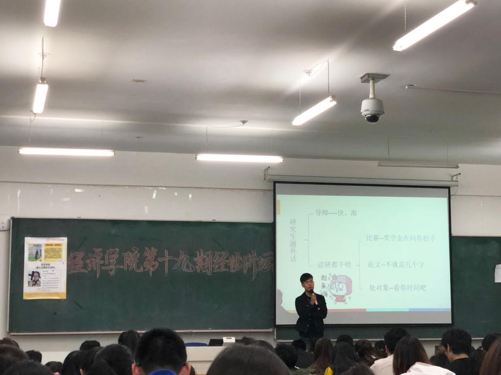 (刘恩权/文)为教育引导大学生科学规划学习目标,增强就业力和职业发展能力,推进学风建设,经济学院于4月19日晚在崇师楼D402举办了第19期“经世讲坛”。本期讲坛邀请原经济学院优秀毕业生马强、成思阳,为与会同学带来了一场精彩的考研经验分享会。
