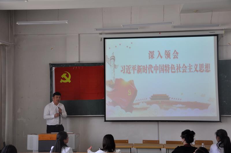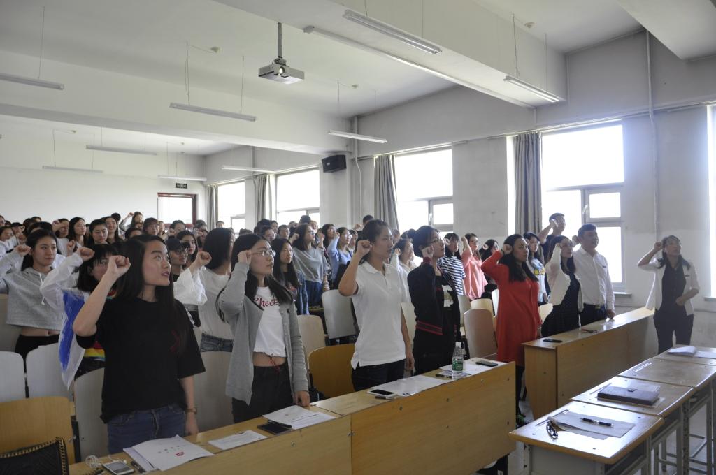 “重温入党志愿书,重温入党谈话,重温入党誓词”三重温环节中,学院选取党员代表研究生王莹和本科生王丹妮重温入党志愿书并宣读入党志愿书,在老师的带领下每名党员都重温了入党志愿书;刘春玲带领大家重温入党谈话,提出三点希望:一、不忘初心,坚定信仰,不断端正入党动机,不断改正自己的主观世界,加强理论学习;二、牢记使命,树立全心全意为人民服务的思想,为同学,为学校服务,毕业前站好最后一班岗;三、争当表率,文明离校,在自己的岗位上再创佳绩。杨晓明老师带领全体党员在党旗前共同重温了入党誓词。最后,杨晓明老师向各位党员详细解读毕业生党员组织关系迁转工作的通知以及学院相关安排。