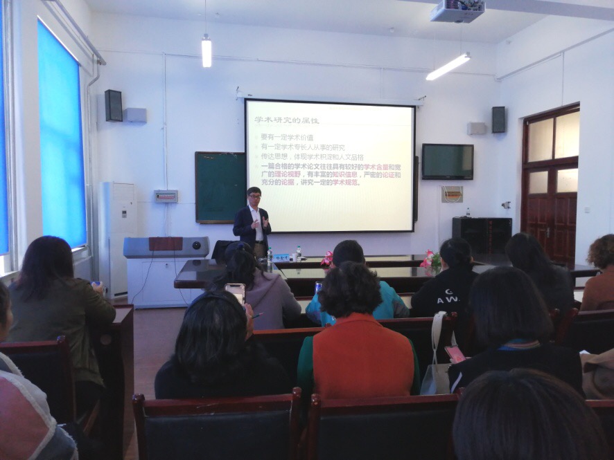 10月14日,杨金才教授在西语楼以“论文选题与研究设计(以文学为例)”为题,通过对2012-2019年国家社科基金课题申报指南进行分析,解读了如何选择课题角度。杨金才教授指出要从服务国家需求并把科研和国家目标的结合的高度认识国家社科基金申报,发表学术论文、出版学术著作、是一种传播学术思想、参与学术建设实践、营造学术道德,创建精神品格的人文活动,是个人具有获得感的重要途径。接着杨教授以“文本细读”的方式,带领大家分析2012-2019年国家社科基金课题申报指南,对如何选择课题角度进行了深层次的解读。随后又论述了新世纪外国文学发展的七个主要趋势,即后现代主义文学与文化研究、后现代主义之后的文学、科技文明反思与生态文学新走向、身体与性别政治、后9·11文学、创伤与历史书写和都市文学创作,并以美、英、日、韩等众多国家的文学创作为例,加以佐证和分析。