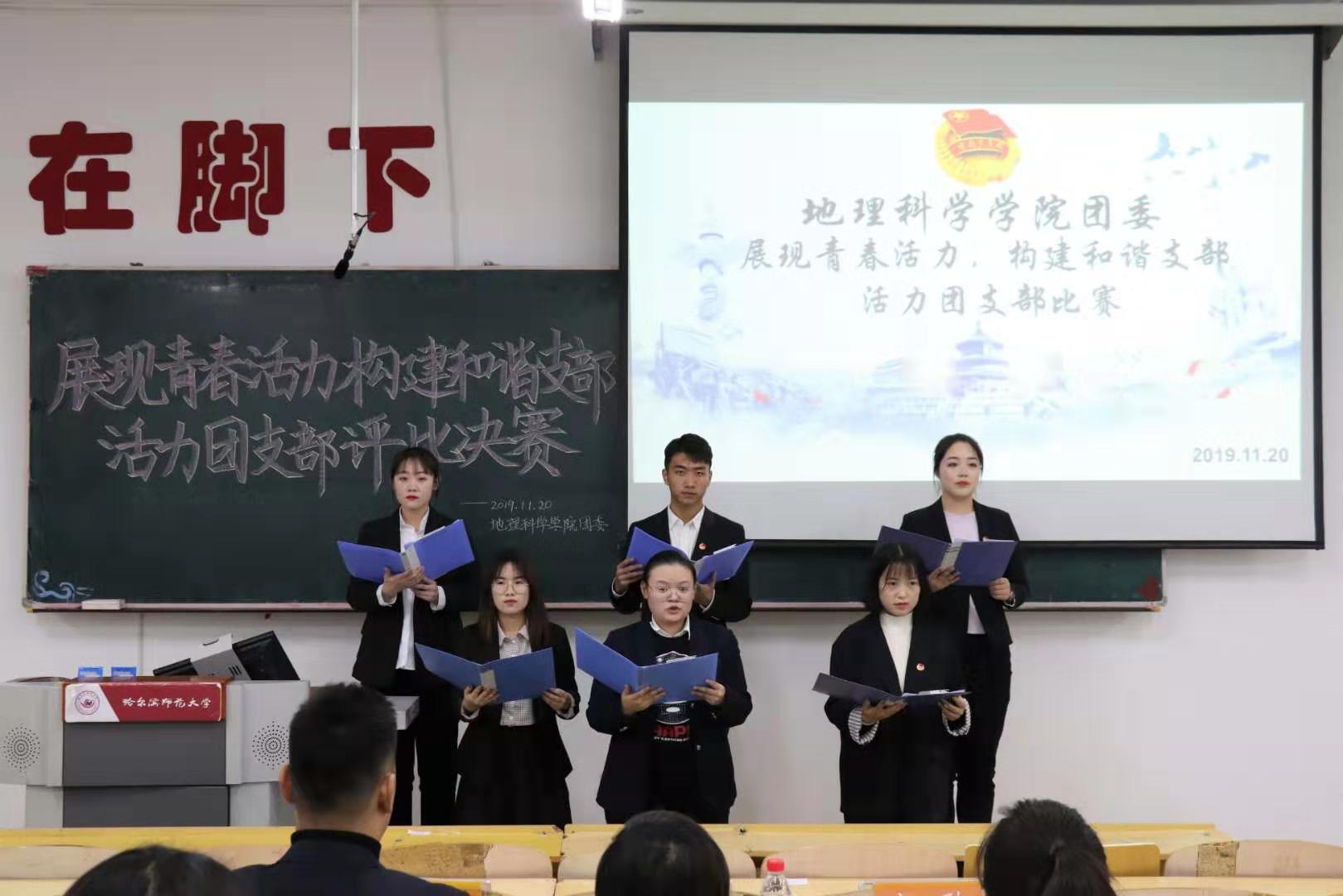 一首诗朗诵《我骄傲,我是地理人》拉开了本次比赛的序幕,地理人昂扬向上的精神风貌感染着在场的每一位同学。一段慷慨激昂的朗诵后,主持人宣布地理科学学院活力团支部评比大赛正式开始。2018级地理信息科学一班团支部、2018级地理科学三班团支部、2018级地理信息科学四班团支部依次进行展示。各班团支书怀揣着饱满的热情展示着属于他们的青春风采。他们从支部建设,团员教育,特色团活等方面向我们展示了一个个积极向上的集体。他们回顾这一年多的经历,回顾着他们的成长与蜕变,从陌生到熟悉,只有经历才会懂得。他们心手相连,一起面对挑战,一起走向未来。2018级地理科学一班团支部、2018级人文地理与城乡规划班团支部和2018级地理信息科学三班团支部依次登场。各班团支书自信的走上舞台,他们总结了一年多的大学生活,向大家展示了各班的特色活动,以及支部构成,并对支部未来发展做出了明确规划。他们用最独特的视角把握时代趋势,身体力行的为大家的展现了身为大学生的青春风貌。