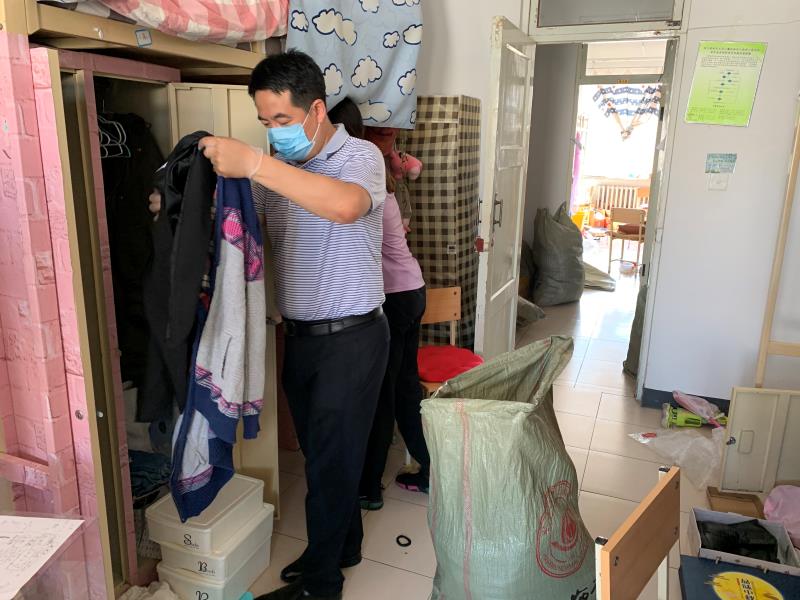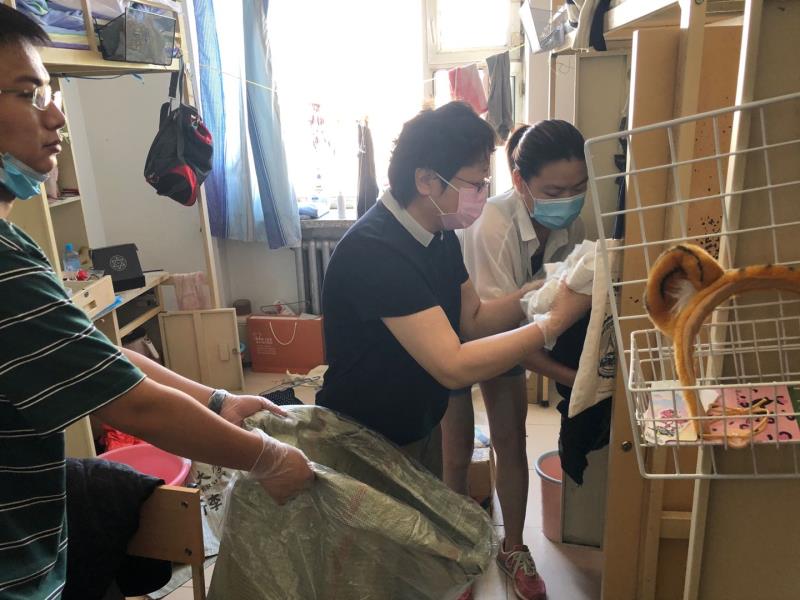 7月1日早上,老师们在教学楼前集合,统一来到学生公寓。按照任务分工,进入到各自的“责任区”,开始了紧张、愉快的物品整理、行李打包工作。老师们和毕业生通过视频连线的方式,一对一、一件件地确认所需要打包邮寄的衣物、书籍等物品,虽然工作繁杂琐碎,但每一位老师都亲切、耐心细致地和同学们进行沟通交流,细心挑拣、用心打包,仔细核对每一件行李信息,确保行李安全邮寄到家。天气炎热,老师们汗流浃背,用他们的辛勤工作,亲手为毕业生们送上了一份来自学院的贴心关爱与温暖祝福。在老师和返校同学们的通力配合下,顺利完成了全部毕业生的行李打包工作。