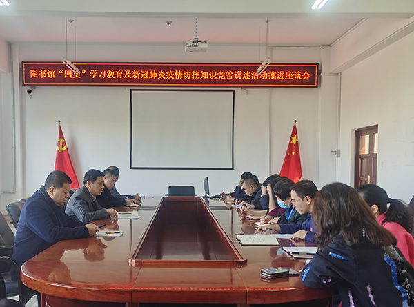 (孙儒/文)为深入学习贯彻落实习近平总书记关于党史、新中国史、改革开放史、社会主义发展史学习及新冠肺炎疫情防控工作的重要讲话和指示精神,持续深化爱国主义教育,按照教育部、省委教育工委和学校党委要求,自2020年9月起,图书馆党委强化主体责任,统筹规划,充分准备,严格遵守疫情防控期间的各级各类管理要求,结合实际,认真组织开展面向图书馆全体教职工的党史、新中国史、改革开放史、社会主义发展史学习教育及新冠肺炎疫情防控知识竞答讲述活动。为确保本次活动达到“高质量、有收获、强意识”的目标,图书馆党委结合活动开展情况,于2020年10月22日下午在江北图书馆四楼会议室举行“四史”学习教育活动交流分享座谈会。图书馆领导班子成员、全体党委委员、各党支部书记、各部门主任及教职工代表参加会议。会议由图书馆党委书记乔峰主持。