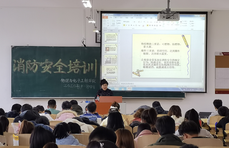 (郝欣/文)为增强学院师生的防火安全意识,提高发生火灾时的疏散能力,帮助师生掌握灭火器的使用方法,11月4日下午13:30,物理与电子工程学院在理工二号楼211室举办防火安全主题教育讲座,学校保卫处王城彬、崔云燕老师担任主讲,学院教师及学生安全信息员参加了本次活动。