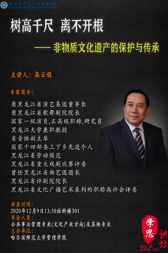 为拓宽学院师生的学术视野,增强学生对非物质文化的保护传承意识,管理学院于12月9日下午在社科楼302举办了第十五期“学思”讲坛,并邀请高云程教授担任主讲,此次报告会的主题是:树高千尺不离根——非物质文化遗产的保护与传承。管理学院副院长徐光主持本场报告会。