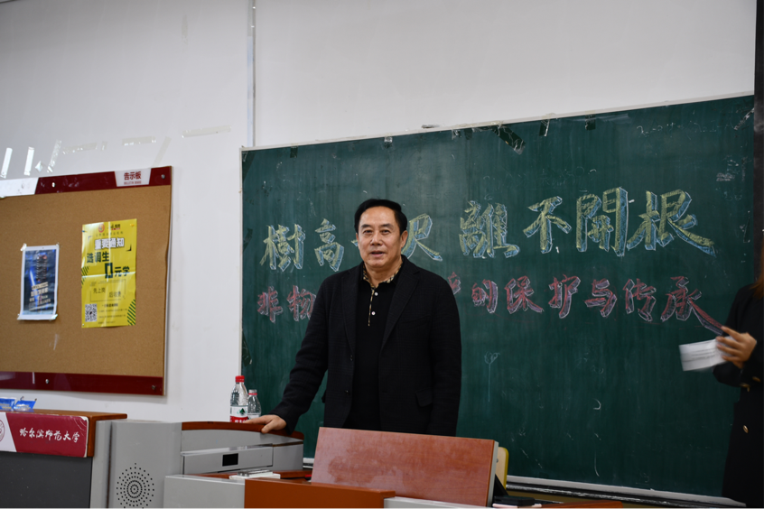 首先,高云程教授讲解非物质文化遗产的由来,引出本次活动主题“树高千尺离不开根—非物质文化遗产的传承与保护”。接着,高云程教授通过p p t详细地讲述非物质文化的两种范畴:口头传统和表现形式。紧接着,高云程教授通过演唱的形式向同学们展示了经典的东北二人转,并讲解了非物质文化遗产管理机构的成立、迫切性、必要性以及传承的保障四个方面,让学生充分认识到非物质文化的多样性。最后,高云程教授根据同学提出的问题答疑解惑,帮助同学们更好的理解活动内容。