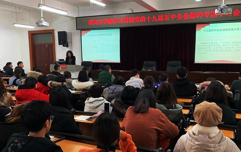 (李昀东/文)2020年12月23日,研究生学院党委理论中心组(扩大)专题学习会在研究生楼412室举行。本次学习会的主题是学习贯彻党的十九届五中全会精神,主讲嘉宾是学校党的十九届五中全会精神、《习近平谈治国理政》第三卷宣讲团成员、马克思主义学院的赵振霞老师。研究生学院党委理论中心组成员、全体教职工、研究生学生党员、研会干部代表100余人参加学习。学习会由研究生学院党委书记张艳君主持。