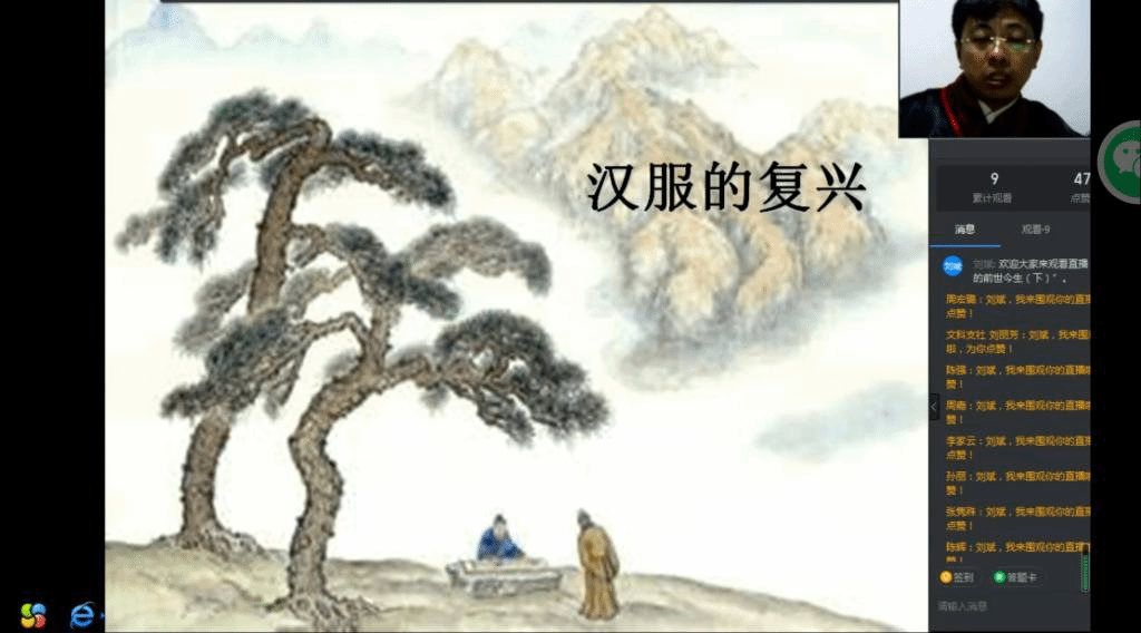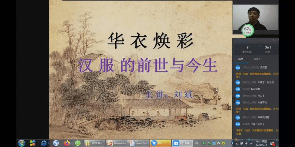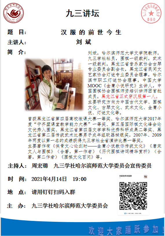 (周宏璐/文)“服装之美谓之华,礼仪之大谓之夏。”恰逢农历三月初三上巳节(公历4月14日),为弘扬中华传统服饰文化,九三学社哈师大委员会第二期“九三讲坛”专题讲座于4月14日晚七点正式开讲。黑龙江省正式穿汉服第一人、九三学社哈师大委员会社员、文学院刘斌教师作《华衣焕彩——汉服的前世与今生》专题讲座。九三学社哈师大委员会社员们早早地进入钉钉直播间,期待刘斌的精彩讲解。