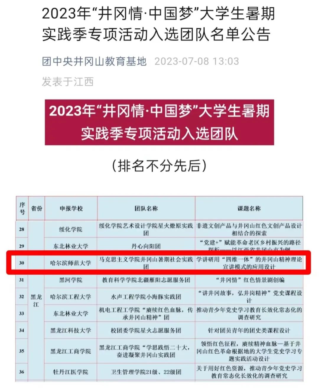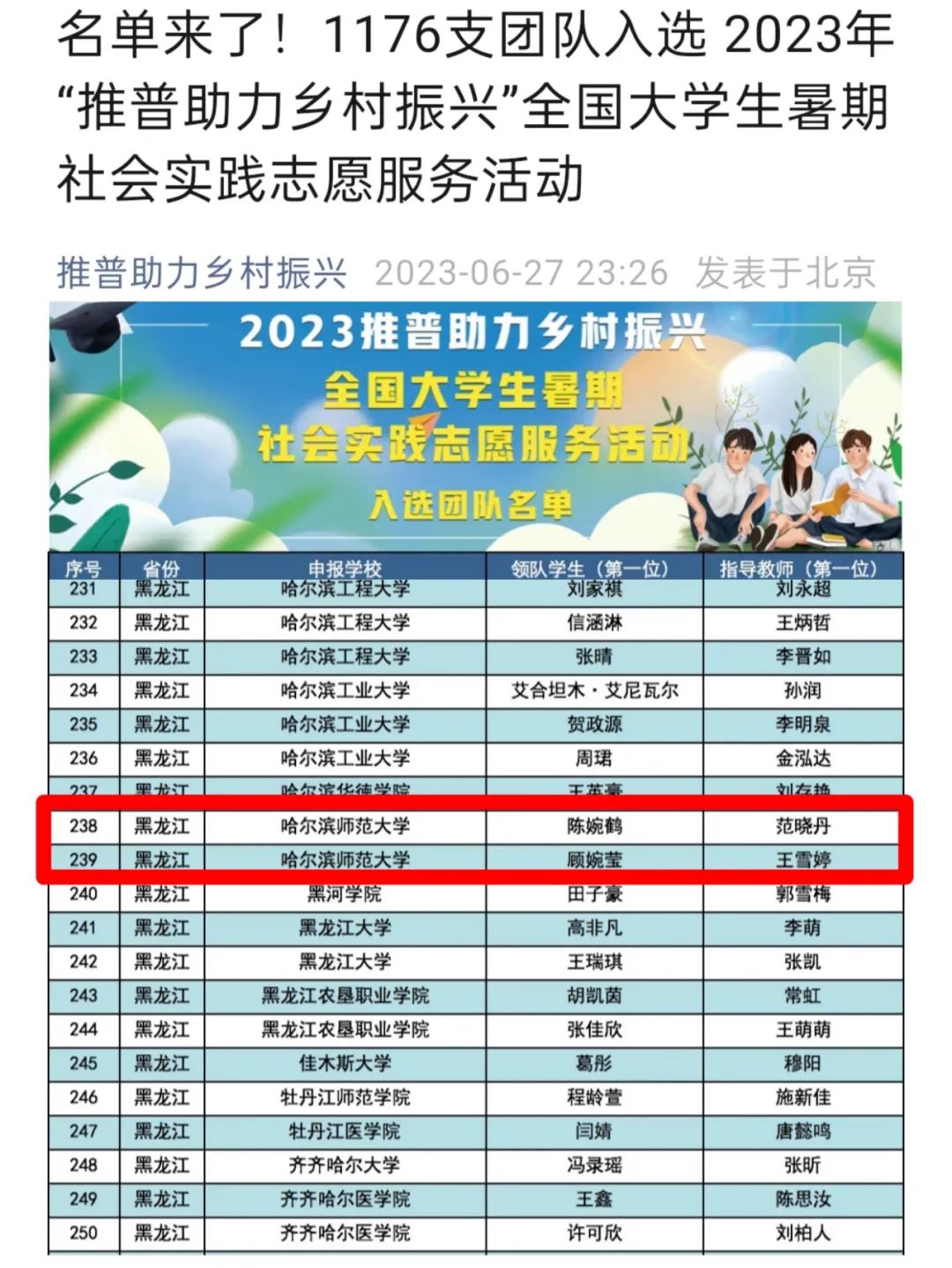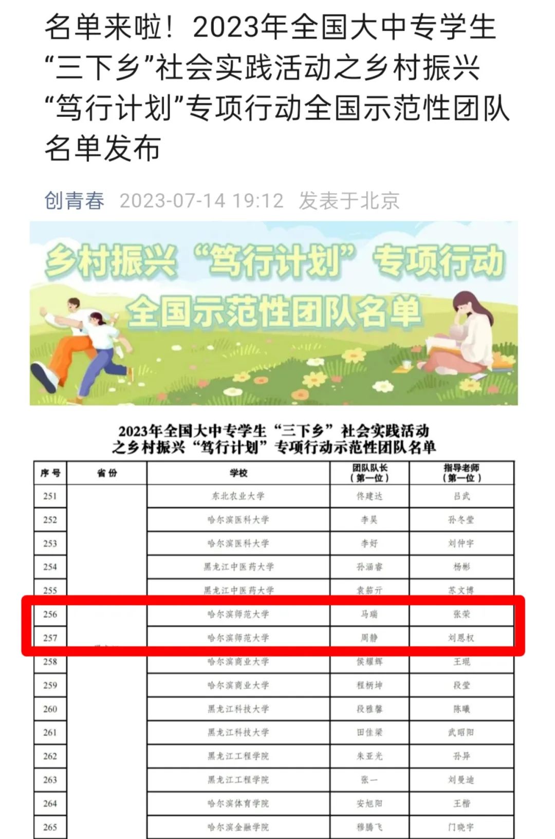 教育科学学院赴哈尔滨市木兰县推普助力乡村振兴服务队、文学院“傲云”社会实践团队入选“推普助力乡村振兴”专项活动。