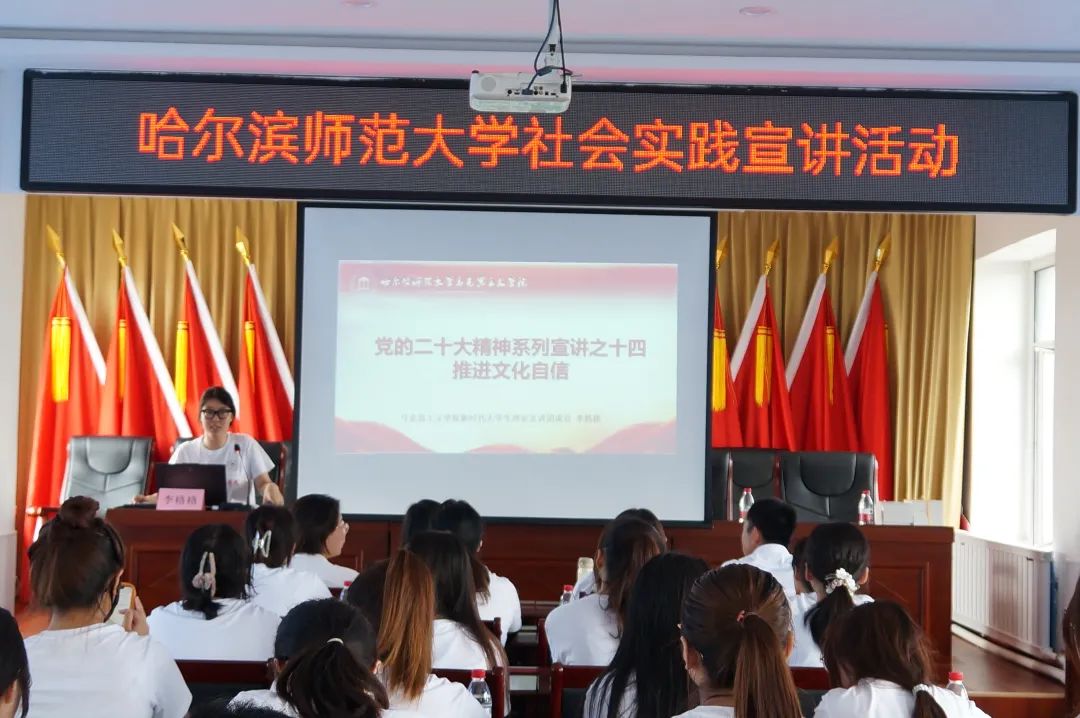 开展一期理论宣讲,深思细悟把握理论精髓。在哈尔滨金雪莲笔业有限公司车间、抗日烈士赵尚志、赵一曼纪念馆和牡丹江市林口县人民政府会议室、牡丹江市林口县柳树镇政府等地,马克思主义学院新时代大学生理论宣讲团成员、“两弹一星”精神和“井冈山”精神志愿宣讲团成员开展理论宣讲,用“青言青语”让党的创新理论“飞入寻常百姓家”。马克思主义学院师生将党的二十大报告的精神要义与地方文化相结合,与乡村振兴的时代主题相结合,强化“马院姓马、在马言马”的鲜明导向,着力营造学精神、悟思想、担使命、践行动的浓厚氛围。