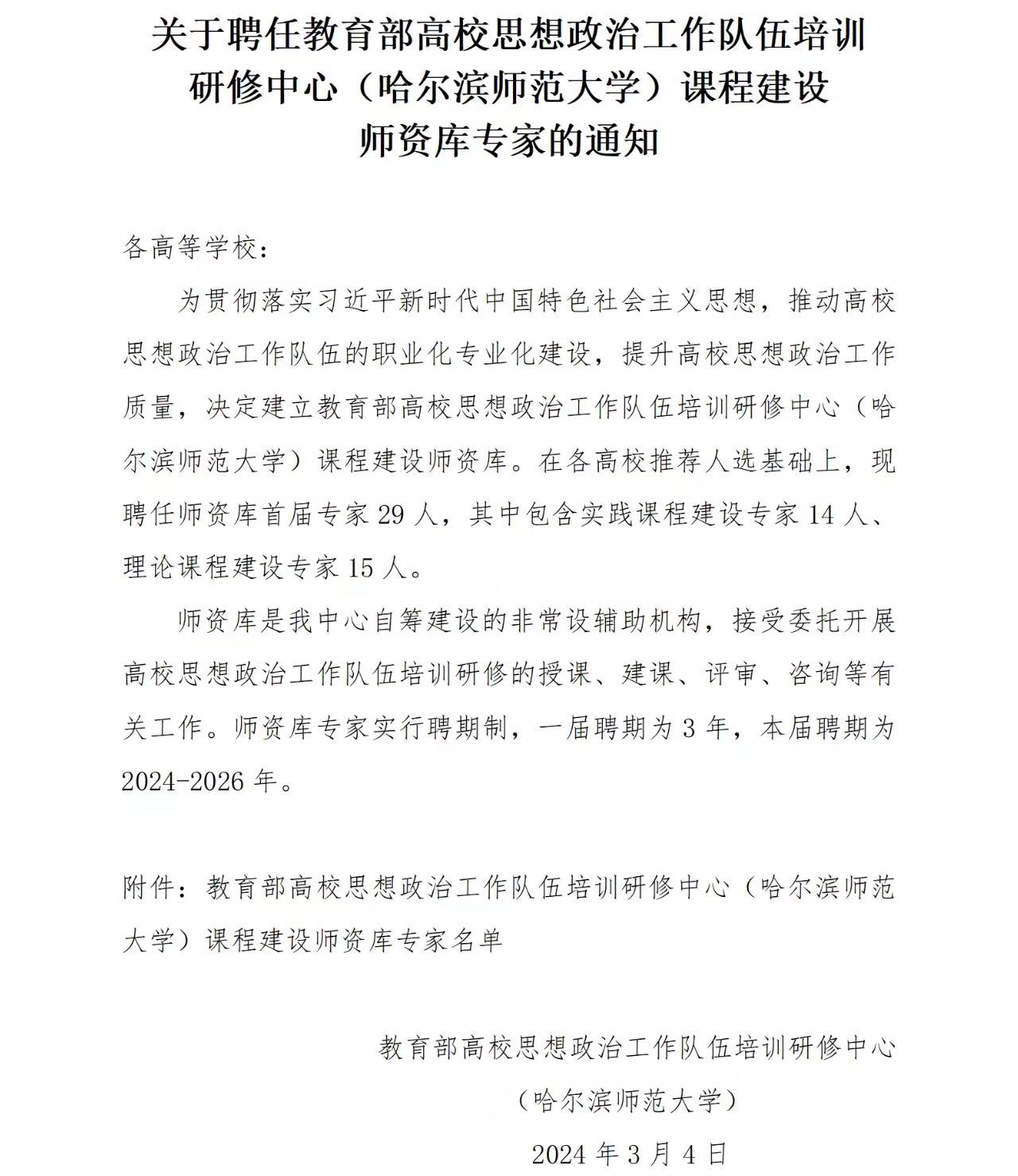 校党委副书记郭砾参会,从三个方面提出了工作要求:一是以深入实施“时代新人铸魂工程”为总体目标,聚焦思政工作队伍主要职责,强化培养目标引领;二是以高质量开展培训研修项目为载体,不断丰富和提高思想政治工作队伍理论与实践能力水平;三是以黑龙江新时代发展战略为基础,打造具有龙江地域特色的高校思政工作品牌。