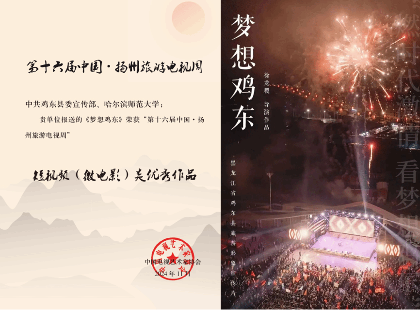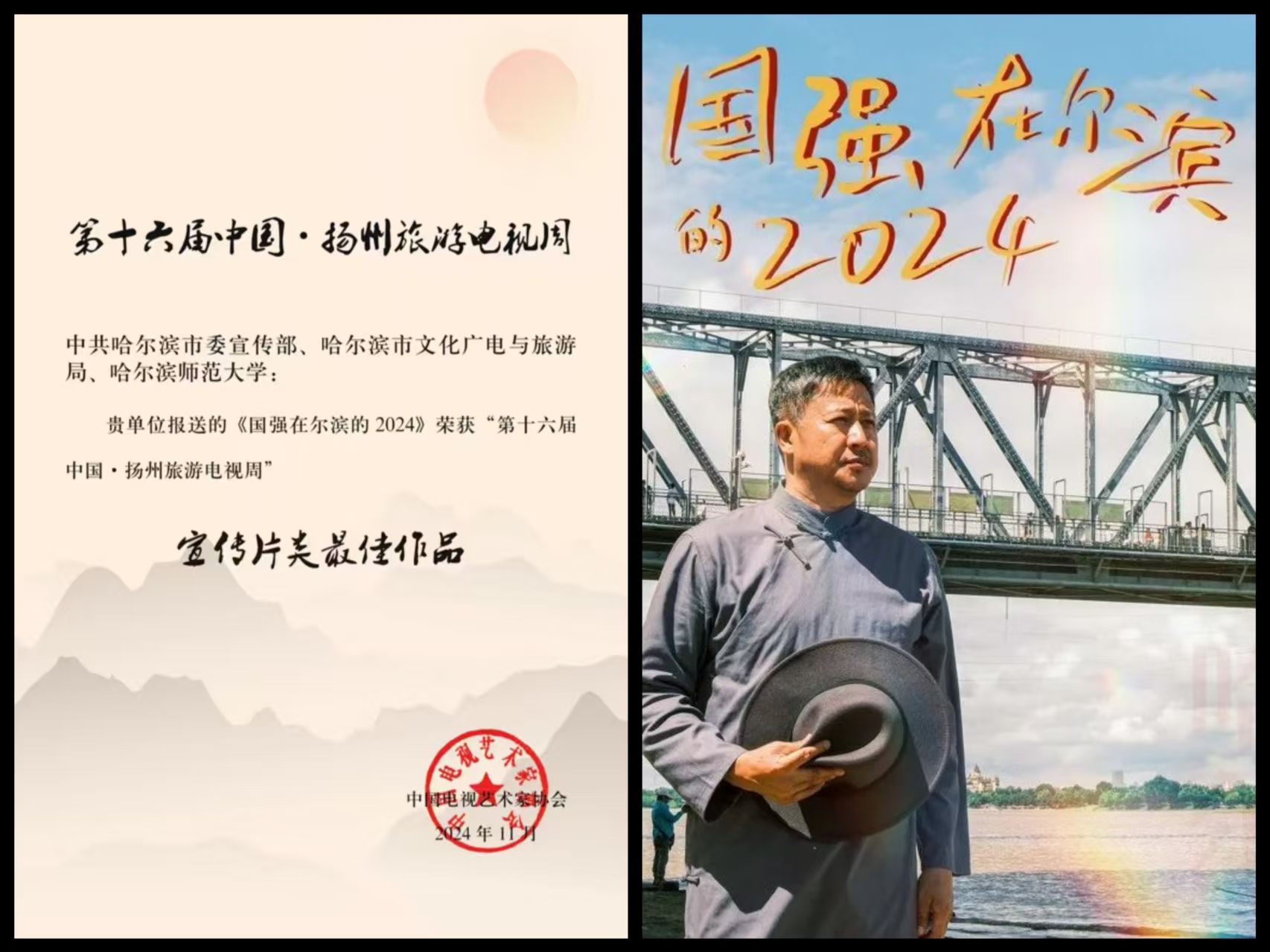 11月12日,由中国电视艺术家协会主办,扬州市广播电视传媒集团(总台)、扬州市文学艺术界联合会承办的第十六届中国·扬州旅游电视周系列活动在江苏省扬州市举行。我校传媒学院师生团队创作的作品《国强在尔滨的2024》和《梦想鸡东》脱颖而出,分别荣获宣传片类“最佳作品”奖项、短视频(微电影)类“优秀作品”奖项。