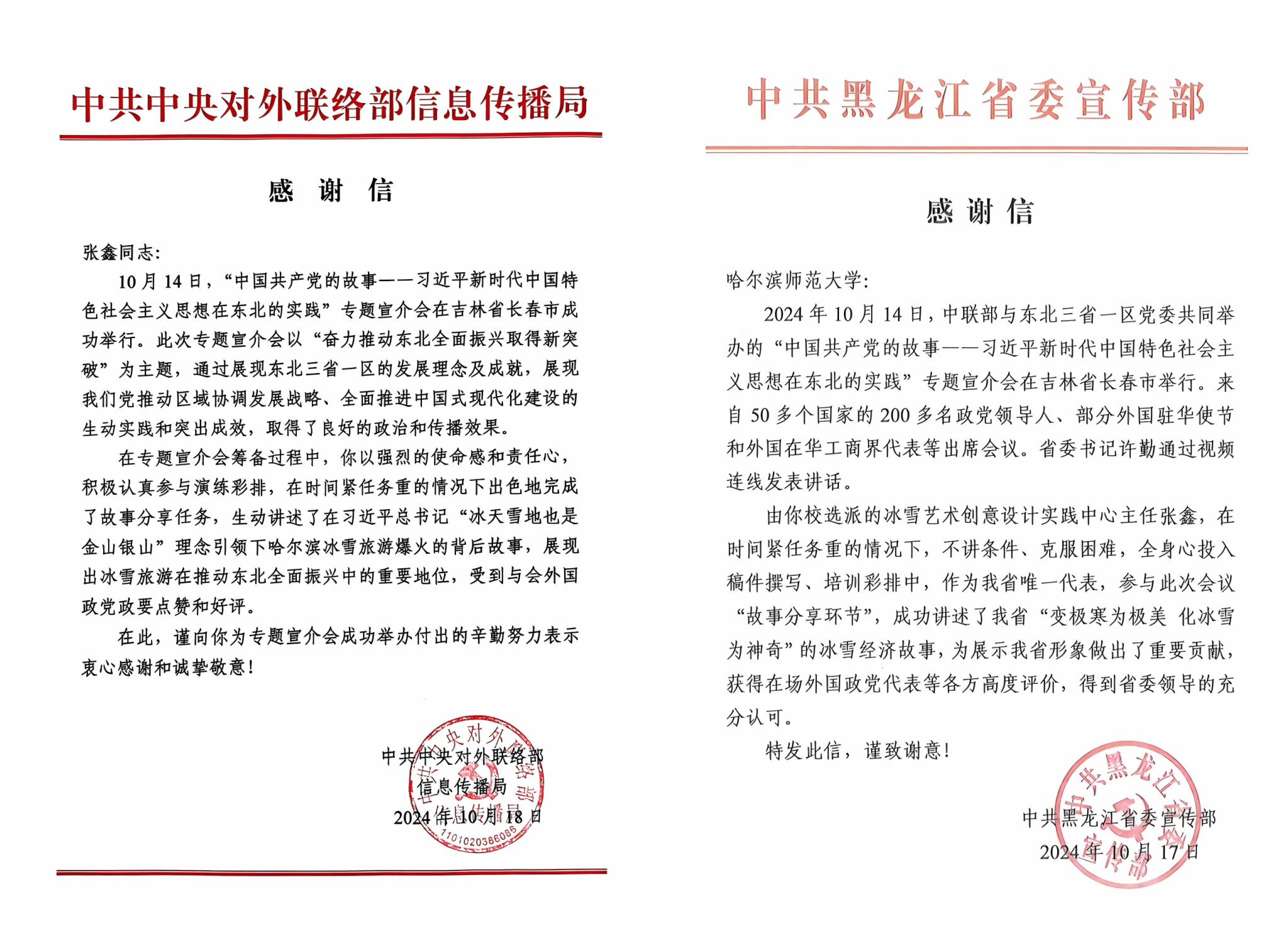 10月14日,由中共中央对外联络部和中共内蒙古自治区党委、辽宁省委、吉林省委、黑龙江省委共同主办的“中国共产党的故事——习近平新时代中国特色社会主义思想在东北的实践”专题宣介会在吉林省长春市举行。来自50多个国家的200多名政党领导人、部分外国驻华使节和外国在华工商界代表等出席会议。哈尔滨师范大学冰雪创意设计实践中心主任、美术学院副教授张鑫在故事分享环节作交流发言。